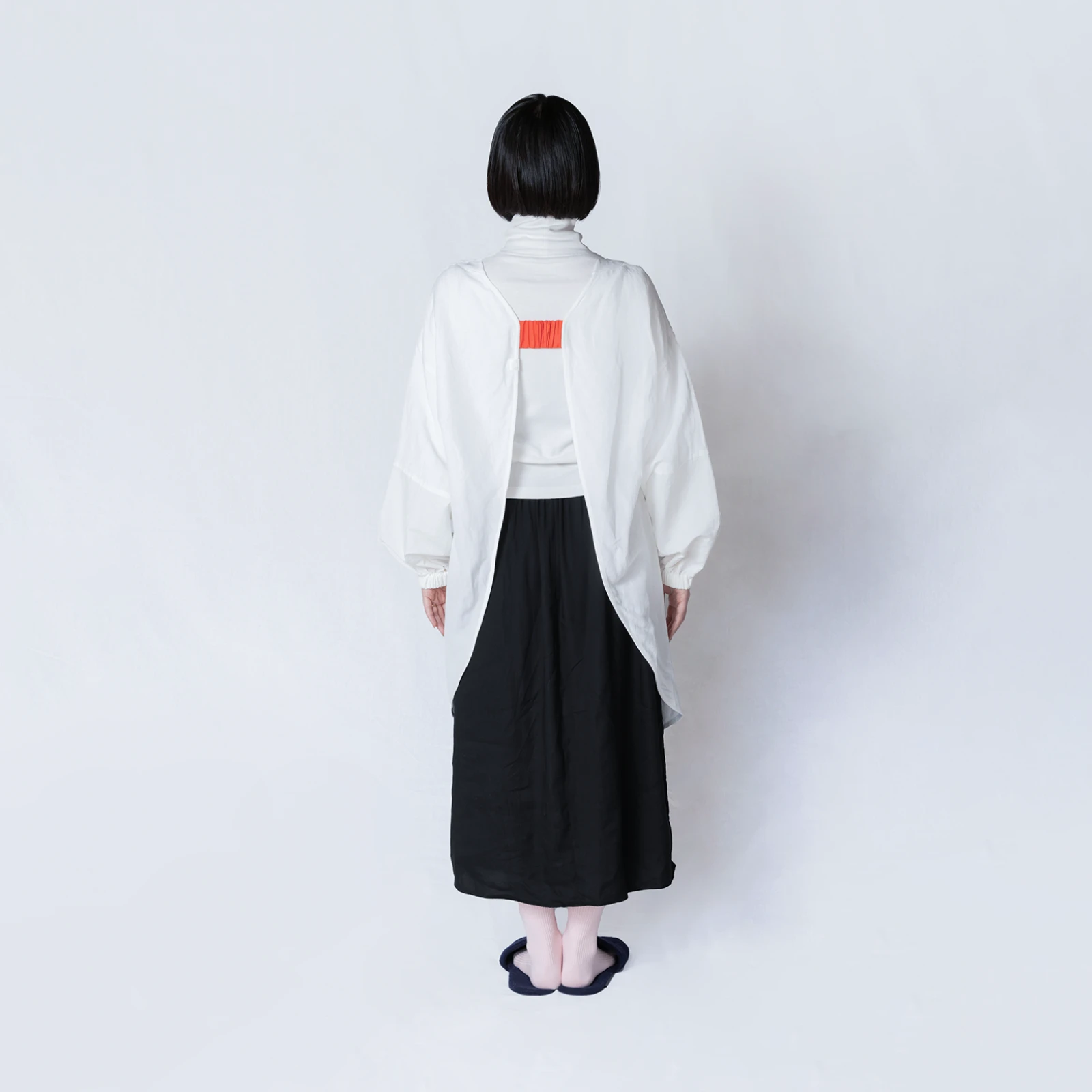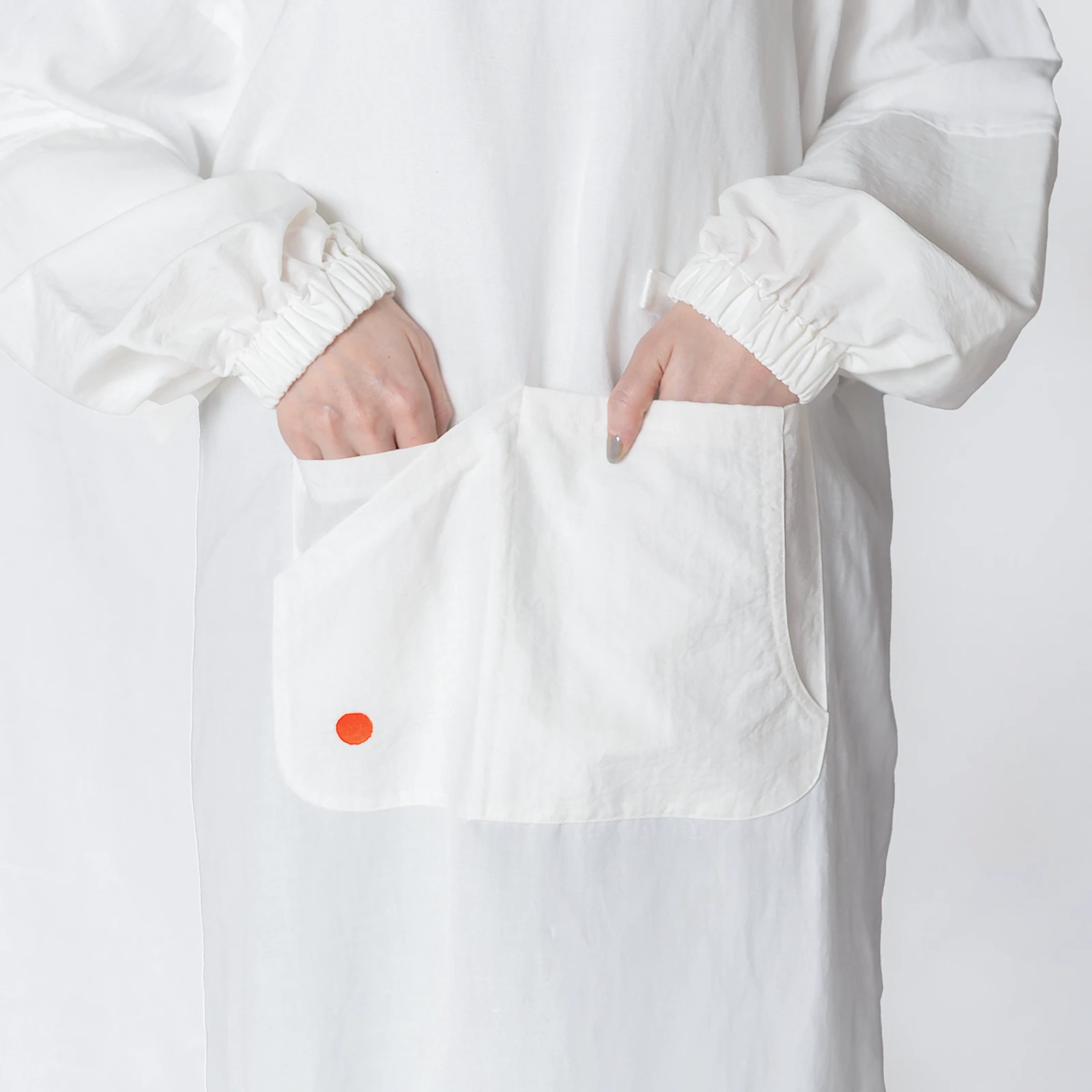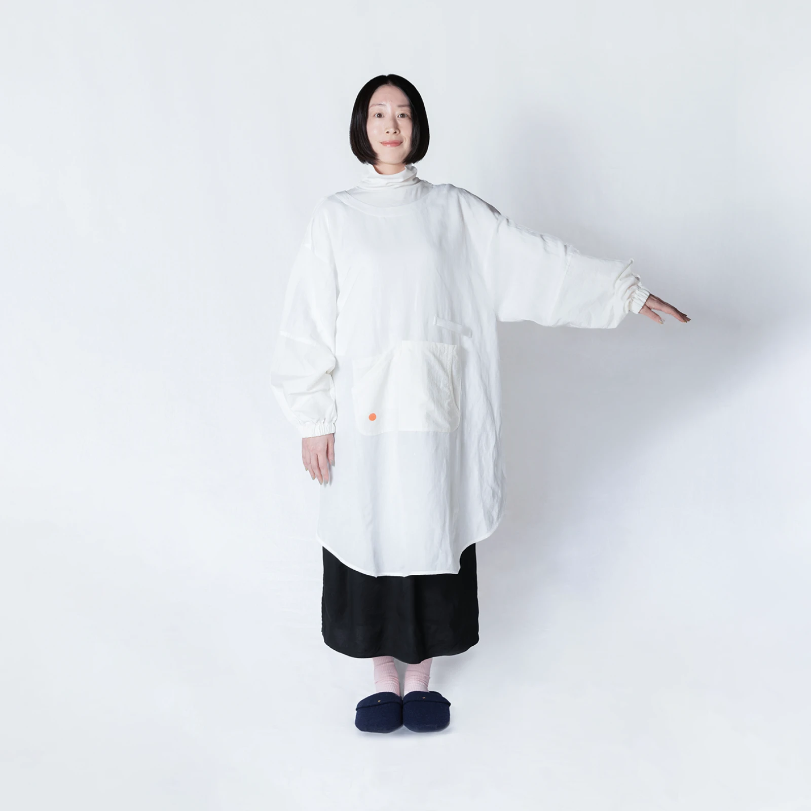 着る人を選ばないみんなにいい(ユニバーサル)デザインの割烹着。かぶるだけで着脱簡単、防水・防汚加工と大容量ポケット付きで、家事も仕事も快適にこなせます。